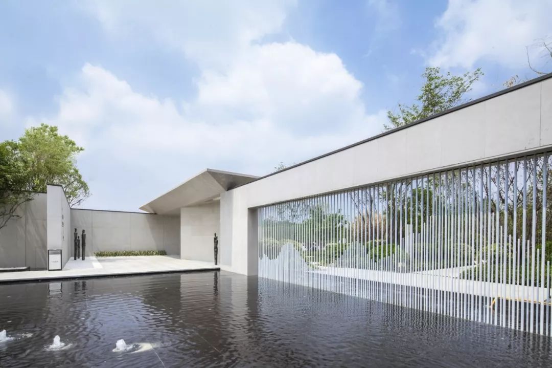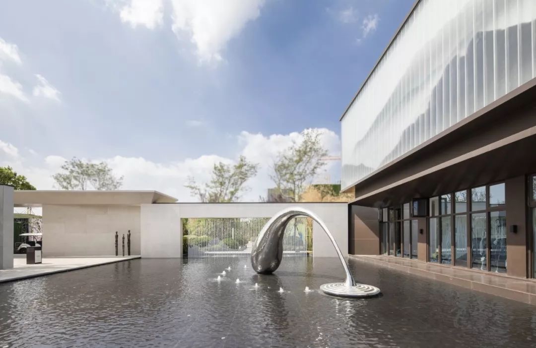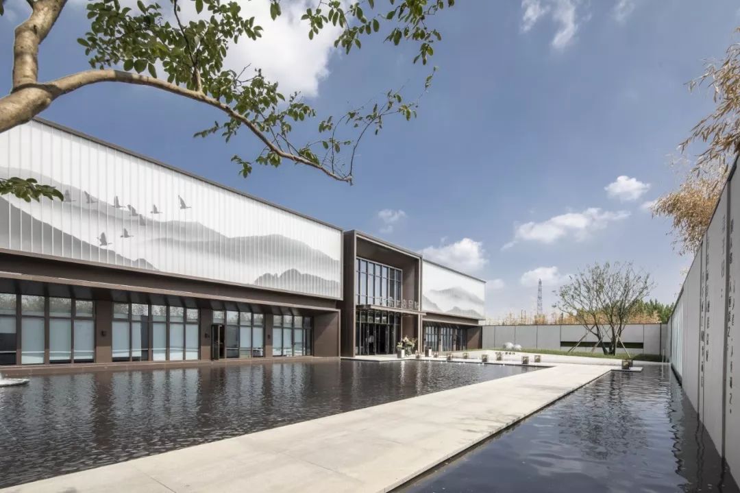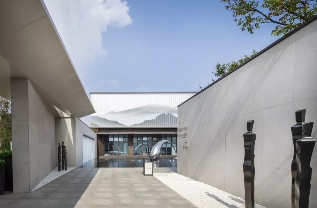 由轉(zhuǎn)換平臺進(jìn)入內(nèi)庭,營造一種在水一方的靜雅,似“天空之境”倒映著建筑光影。步履緩緩向前,山水相依,再現(xiàn)文人的“縱享山水,閑適自得”理想居所,以簡潔含蓄的設(shè)計手法烘托出精致大氣的售樓部建筑。