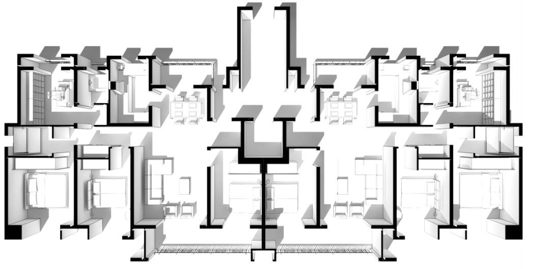 三段式設(shè)計使得建筑整體造型簡潔大氣、典雅莊重。色調(diào)上采用黑白灰配以中國紅色調(diào),在建筑頭部以及空調(diào)格柵采用傳統(tǒng)中式窗花點綴,形成現(xiàn)代中式風(fēng)格,使得社區(qū)成為融入運河風(fēng)光帶上一道亮麗的風(fēng)景。