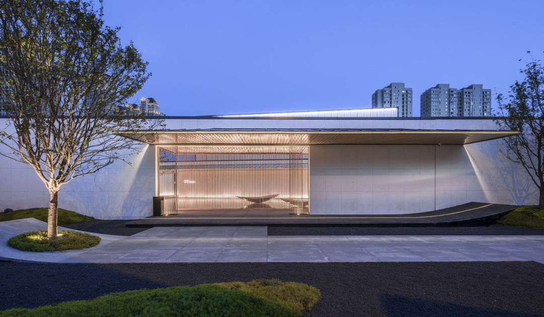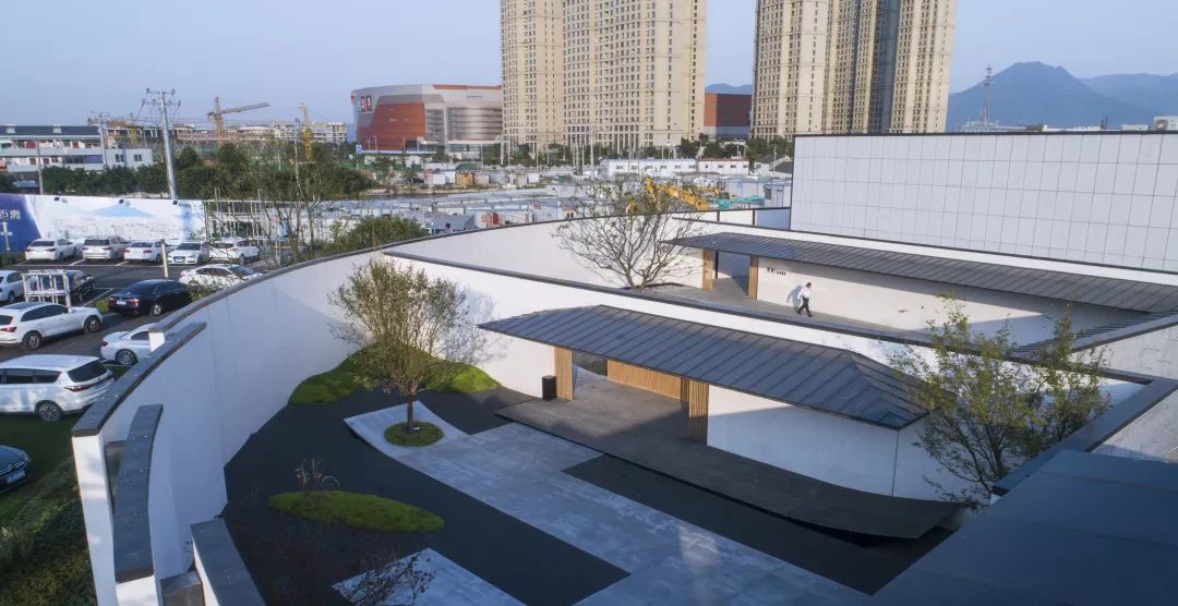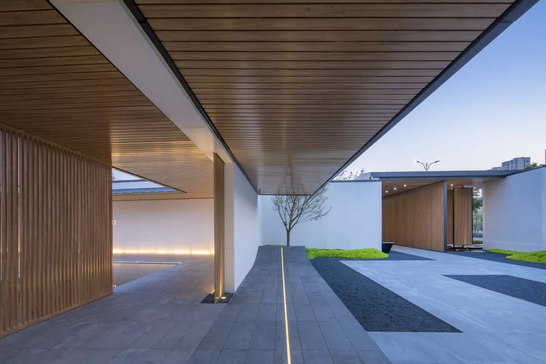 源起東甌王廟的欄桿屋架與山石基座,經(jīng)由設(shè)計(jì)師的提煉抽離,融合在本案中。出檐深遠(yuǎn)的金屬屋面,賦予了傳統(tǒng)建筑大挑檐屋面的時(shí)代意義;從山石基座中演化而成的樓層基座與首層門頭,簡(jiǎn)約大方又極具現(xiàn)代摩登感;立面橫向線條的處理手法,在強(qiáng)調(diào)造型感的同時(shí),也增加了建筑整體的輕盈感,比例均衡卻又虛實(shí)明確,營造出充滿現(xiàn)代感的中式立面效果。