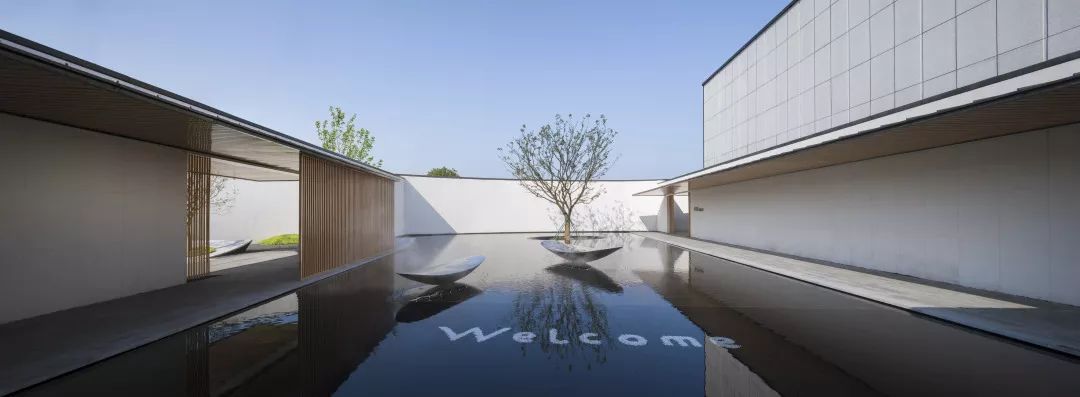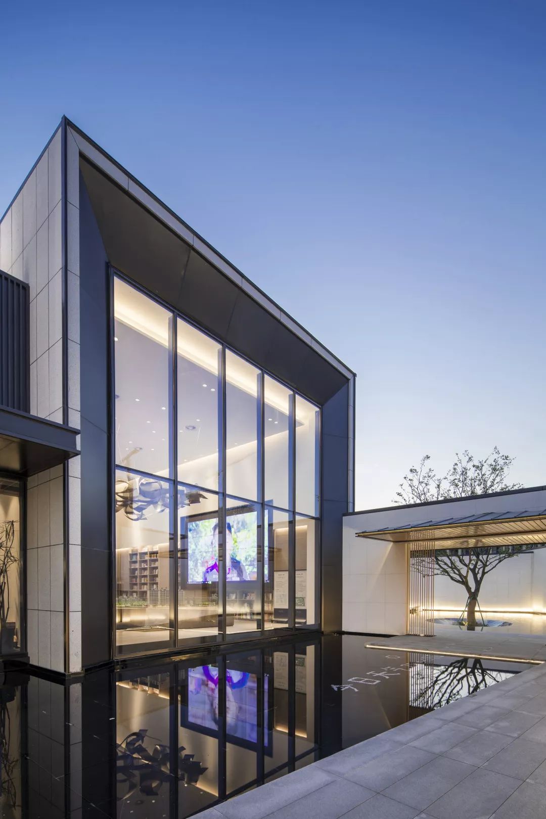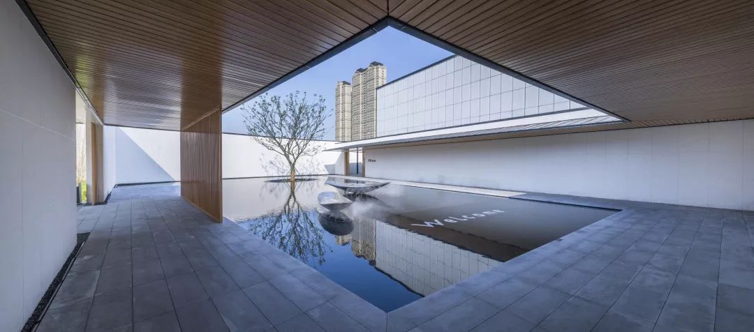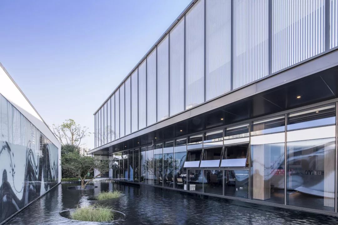 配合現(xiàn)代古典風(fēng)格的建筑主體,同時(shí)也考慮了與周邊山水自然環(huán)境之間的關(guān)系,在建筑材料的選擇上充分考慮了溫瑞塘河景觀的視覺舒適度,以炭灰色鋁板、淺灰色石材為主基調(diào),搭配炭灰色金屬漆作為點(diǎn)綴,形成層次分明的視覺焦點(diǎn)。