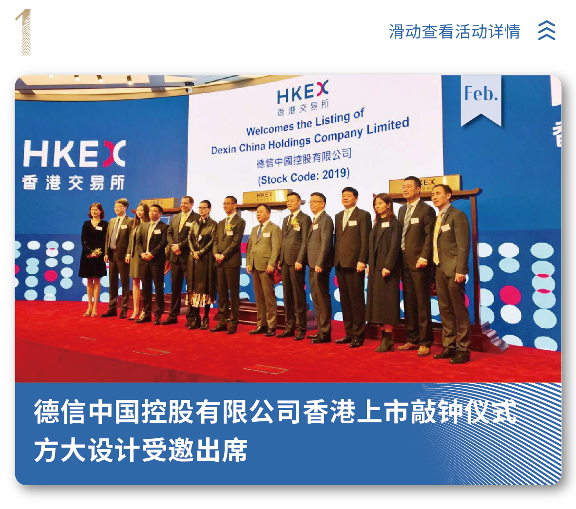 2019年2月26日,德信中國在香港聯(lián)交所主板成功上市。方大設(shè)計作為德信香港上市公司股東受邀參加德信香港上市敲鐘儀式。