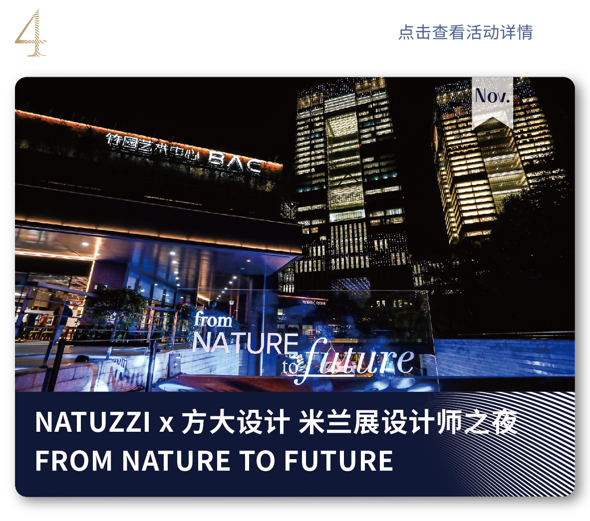 2019年11月20日,作為2019上海米蘭展設(shè)計師之夜的同期活動,方大設(shè)計攜手NATUZZI 納圖茲集團在BAC竹園藝術(shù)中心,以“FROM NATURE TO FUTURE”為主題,舉辦了NATUZZI x 方大設(shè)計 米蘭展設(shè)計師之夜活動。