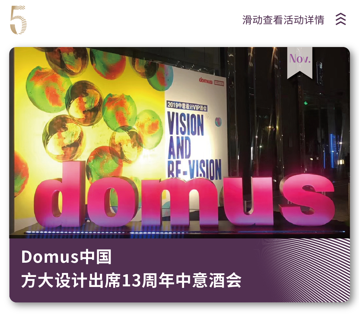 2019年11月21日,由《domus國際中文版》舉辦的主題為“Vision & Re-Vision”2019中意設(shè)計VIP酒會在上海盛大舉行,方大設(shè)計受邀出席活動并與當(dāng)晚嘉賓共同度過了一個美妙的夜晚。
