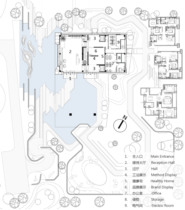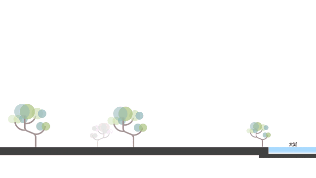 由于作為示范區(qū)的藝術中心選址與太湖駁岸之間尚有沿河綠帶及道路相隔,且沿湖濱道路的行道樹主要為高大的香樟樹,其平均高度超過6米,嚴重遮擋了建筑底層的觀景視線;為打破這個格局,設計采用了有別于常規(guī)示范區(qū)的流線組織,將展示區(qū)、洽談區(qū)等主要功能提升至三層,并設置大片通透的玻璃幕墻作為觀景外窗,打通室內外空間上的視覺廊道,保證訪客立于窗前時,視線越過香樟樹頂,一覽太湖的水景天光。