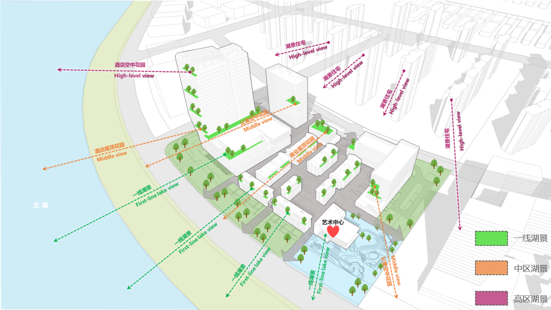 觀景太湖是項目需要打造的核心價值,方案采用了構建立體視線通廊的規(guī)劃理念,為各業(yè)態(tài)的建筑引進最大化的湖景視野,實現從水平到豎向,從地面到空中的三維觀景體系,實現觀景角度與維度的統一。