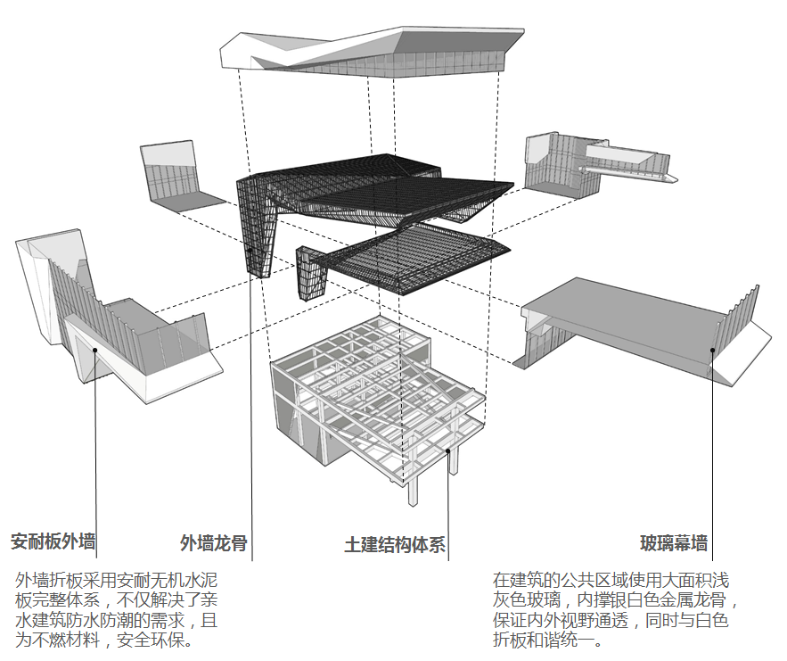 為達到外立面無縫的造型要求,設計引進安耐板作為建筑的外墻材料。