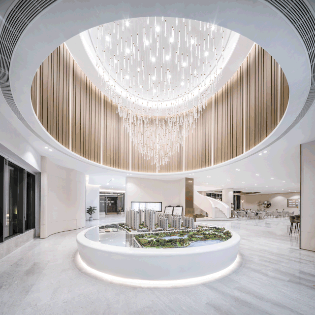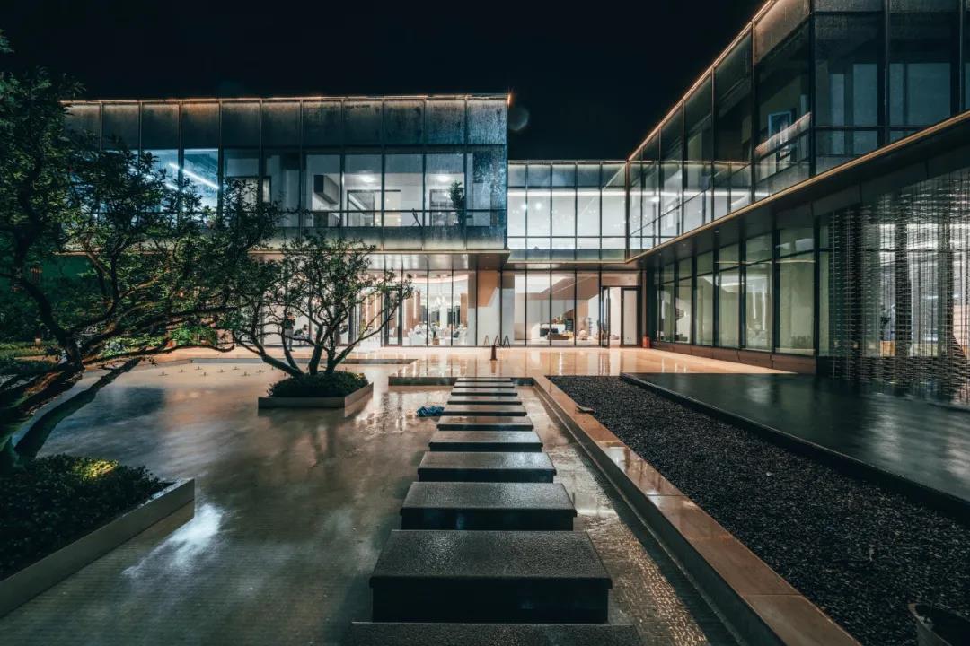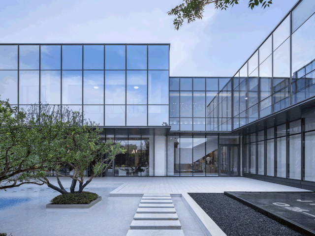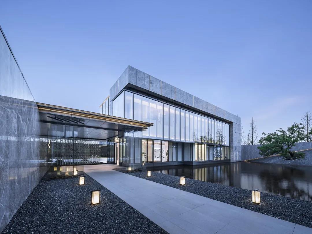 銷售中心通體方正、造型結(jié)構(gòu)極簡,以正方形體塊為基礎(chǔ),設(shè)計師按照功能要求,進(jìn)行體塊的切分及穿插轉(zhuǎn)折。建筑的南側(cè)及西側(cè)為展示面,為延引更多景觀視野進(jìn)入室內(nèi),故而做了加寬加長的處理,總體略呈“L”形;而在“L”形的后端,恰好為示范區(qū)后場留出較大的內(nèi)院空間,可供來賓流連欣賞。