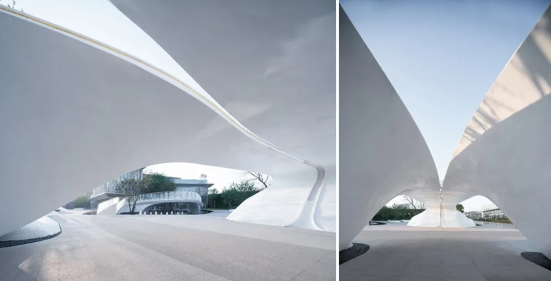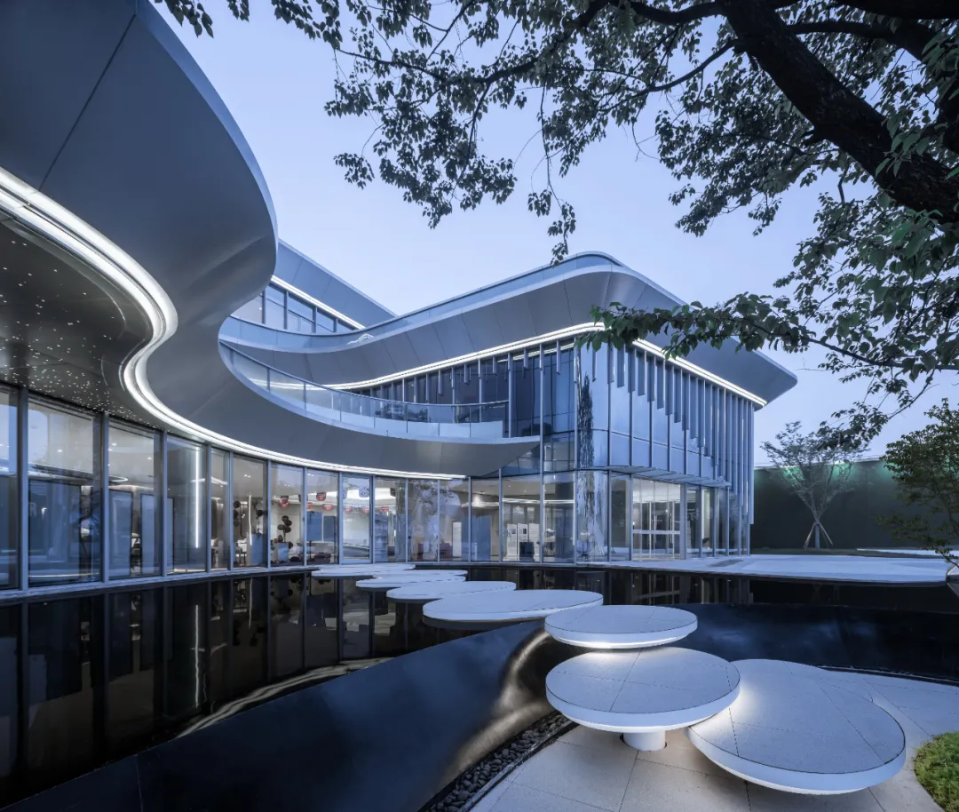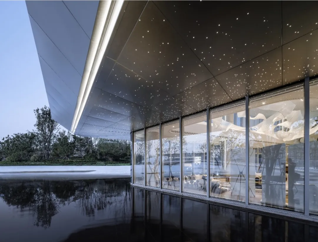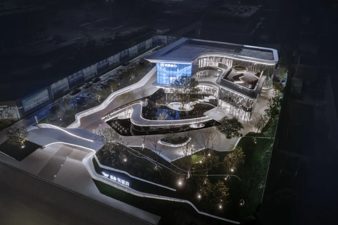 東望府生活美學館,用藝術化的建筑語言,結合高科技的現(xiàn)代材料,以靈動的造型形態(tài)、充滿魅力的光影變幻,實現(xiàn)了充滿想象力的時空穿越體驗,為高科技園區(qū)基地帶來新的集聚角落,打卡空間。