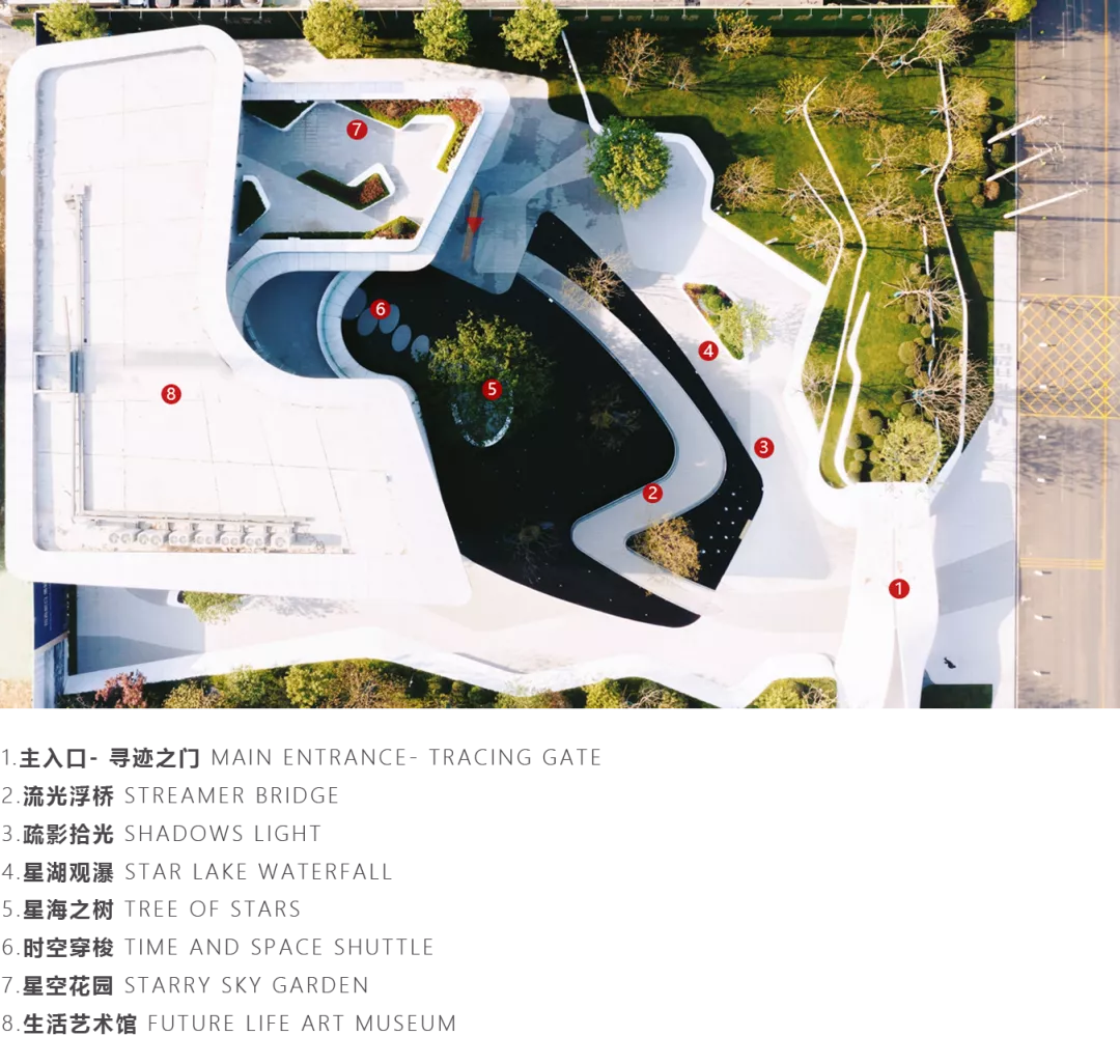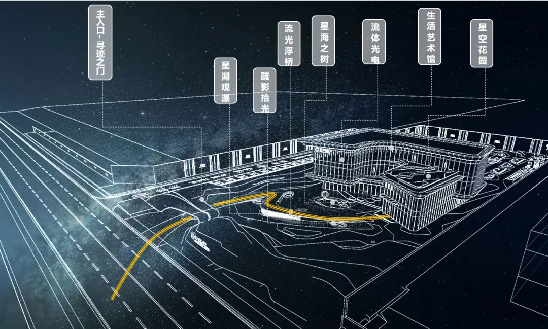 場地景觀延續(xù)建筑的設計概念,采用星空的設計語言、通過現(xiàn)代藝術手法,對概念主題的“星跡”空間元素進行抽象化,以幾何構成的形式,表現(xiàn)星空運轉的軌跡,打造沉浸式的景觀體驗。
