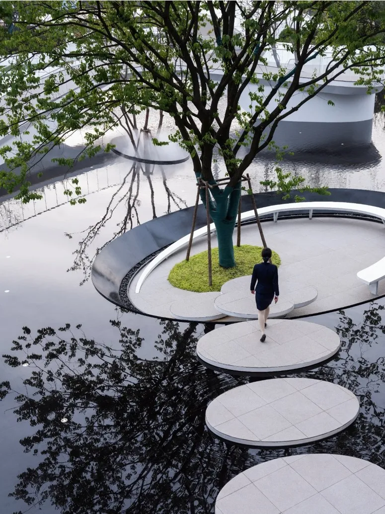 植物、踏板與水中的倒影相互輝映,猶如無限遼闊的瀚海星河,漫步其中,愜意而放松。