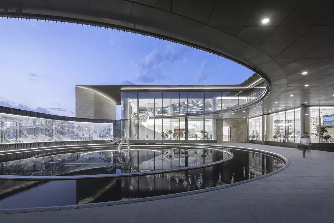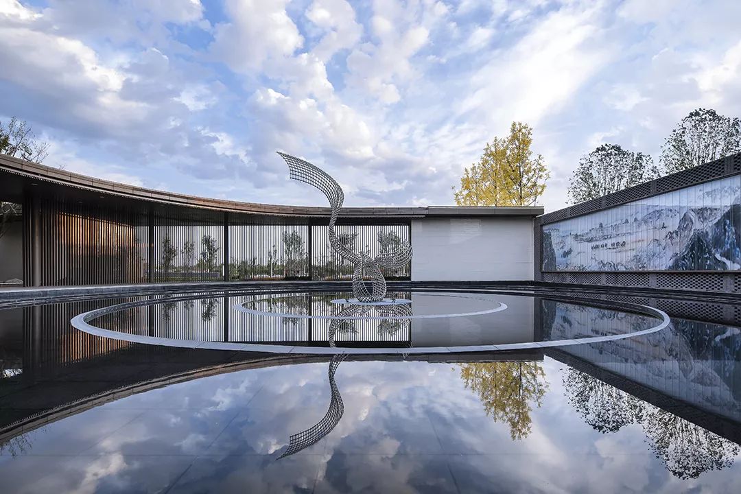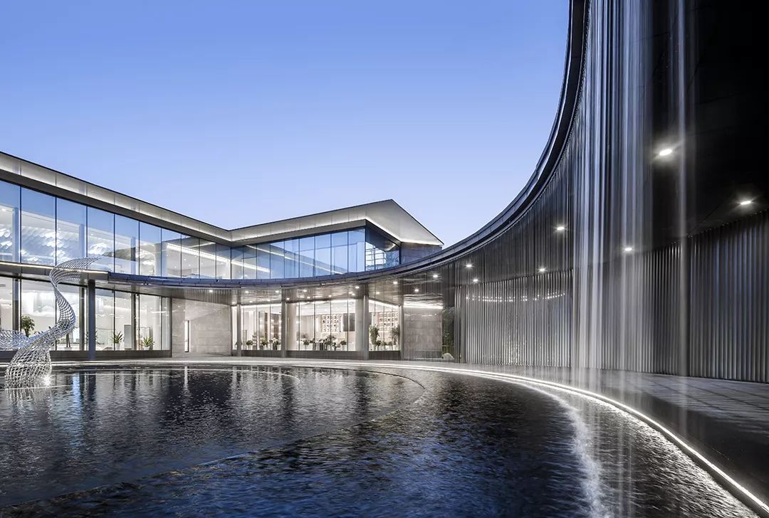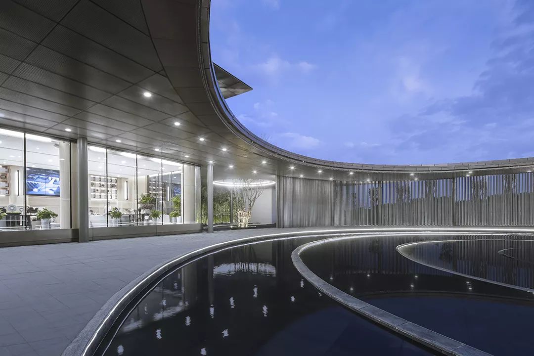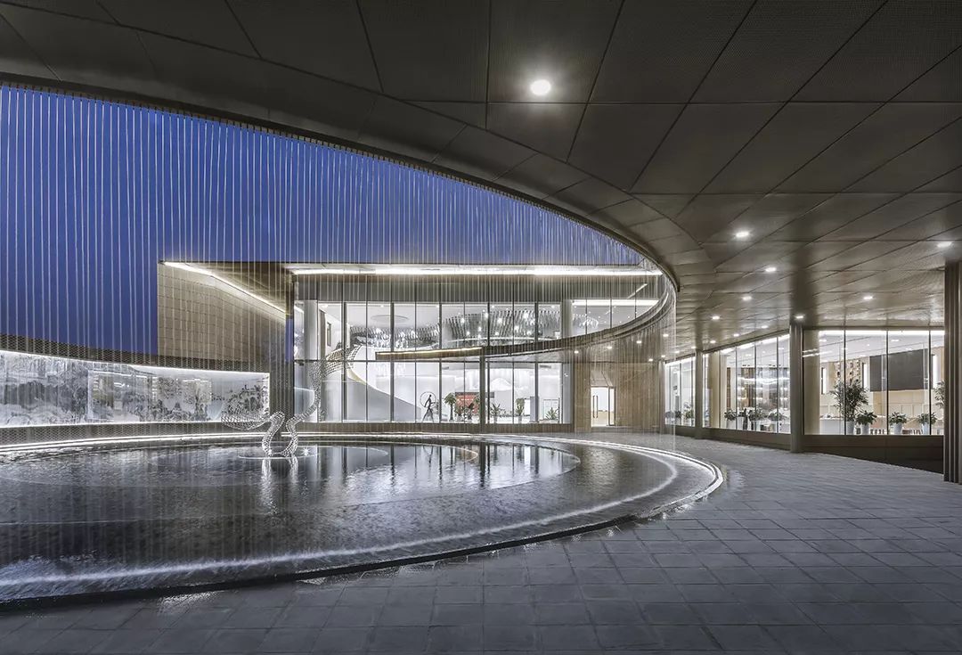 水的多變性與不穩(wěn)定性與絲綢相似,作為建筑元素更可烘托長安古城“渭水貫城,以象天漢”的古都?xì)鈩?。方正的建筑主體中“生長”出的曲線景觀廊道,拉長了參觀動線,弧形景觀通廊的手法配合水幕裝置,以動態(tài)的手法,從視覺和觸覺上模擬絲綢柔的質(zhì)感,將“絲綢”的“柔”從抽象的概念轉(zhuǎn)化為生動的建筑語言,使原本略顯局促的前場空間更具豐富的體驗(yàn),并成功將客戶引入室內(nèi)感受到更為細(xì)致的“絲綢”感受,增加儀式感。