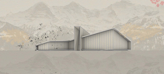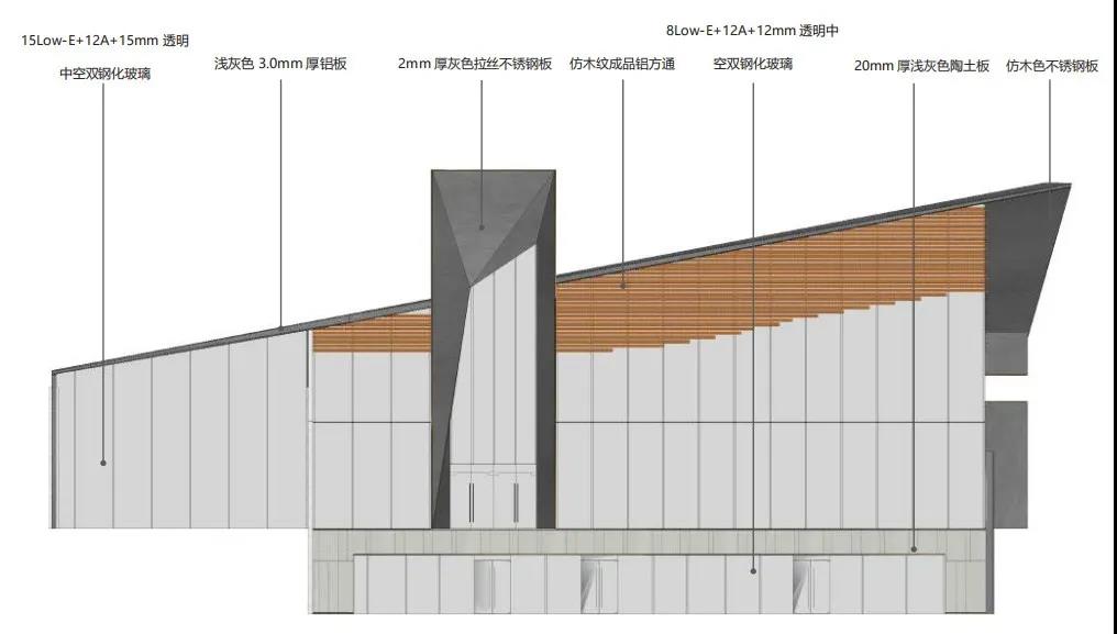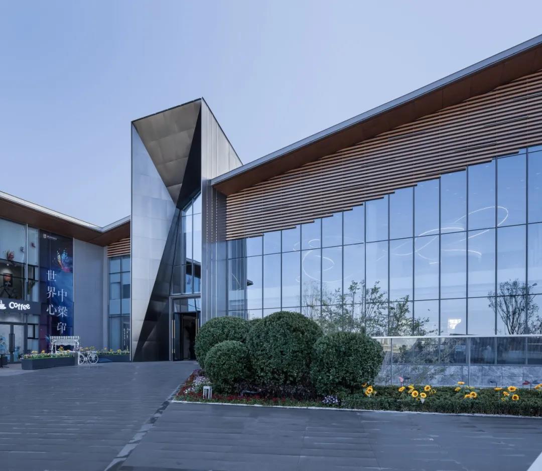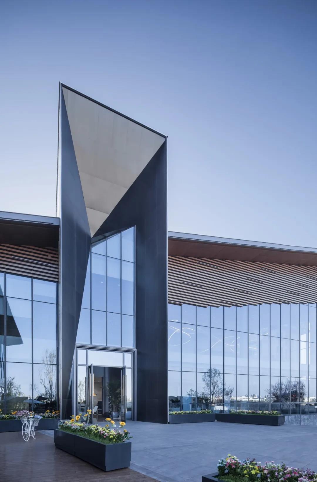 示范區(qū)建筑總體為“L”形走勢(shì),以中部垂直高聳的楔形體塊為入口,其余部分兩翼張開(kāi),左側(cè)轉(zhuǎn)折平緩,右側(cè)延續(xù)高起,呈非對(duì)稱(chēng)的構(gòu)成形式,體現(xiàn)山巒疊嶂的造型意向。