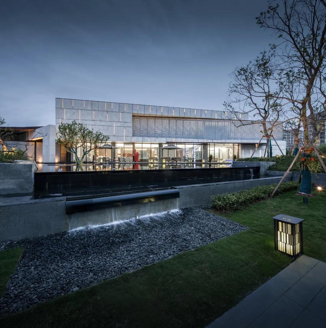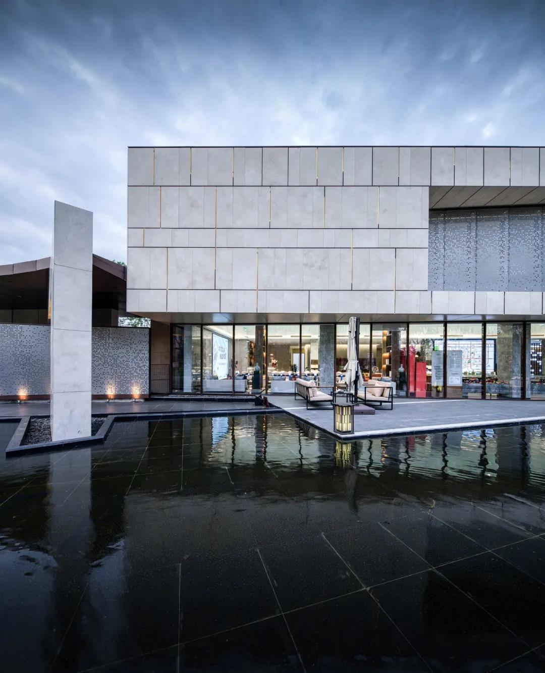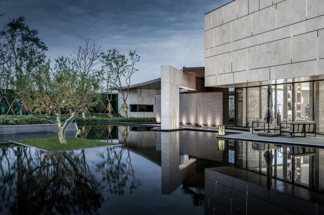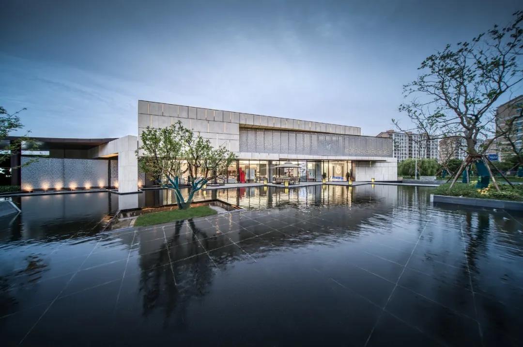 以江南水院為題的示范區(qū),前場開闊,它以波瀾不驚,卻波光粼粼的鏡面水池,作為山水文化中 “水”之隱喻;而藝術(shù)館,造型沉穩(wěn),塊壘相加,恰如山的層巒疊嶂。山館挺拔方正,鏡池秀美婉約,再以庭樹、綠地相襯,成為南莊河畔沿河的靚麗一角。