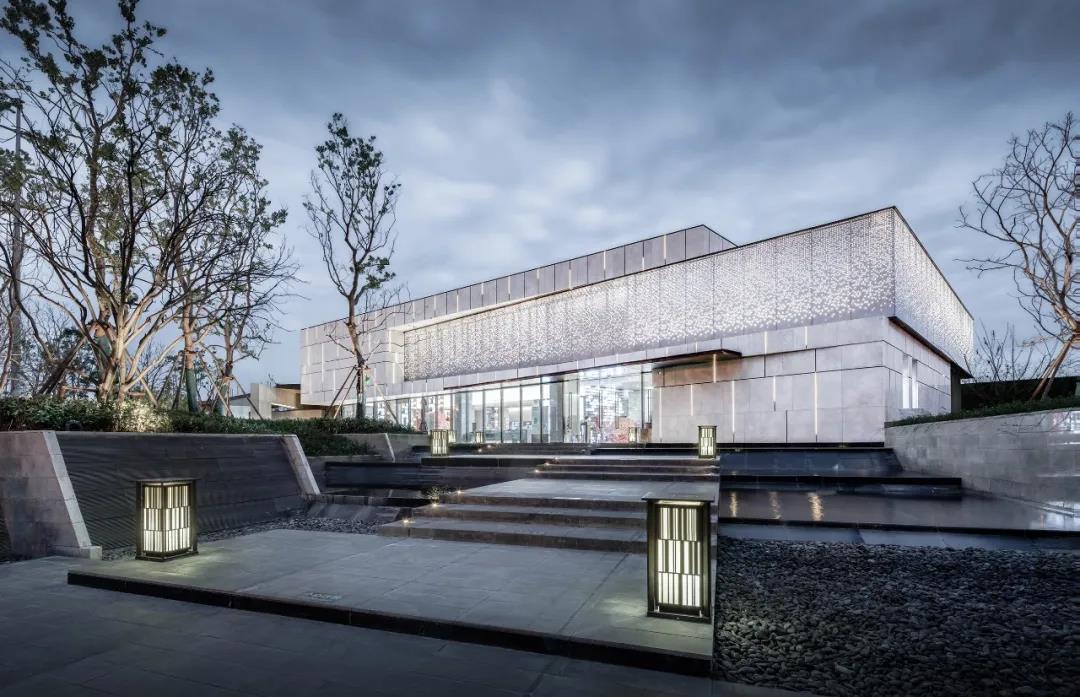 藝術(shù)館為兩層建筑,但兩層的建筑輪廓卻因造型的關(guān)系不盡相同。首層以通透的玻璃幕墻結(jié)合石材面圍合,左空右實(shí),利于室內(nèi)觀景;二層采用石材與穿孔板以斜向交角穿插而成,既有石材的穩(wěn)重大方,也有金屬板的光澤明亮;同時(shí),在石材外墻中嵌入非等距的豎向燈槽,增加石材立面的靈活性。