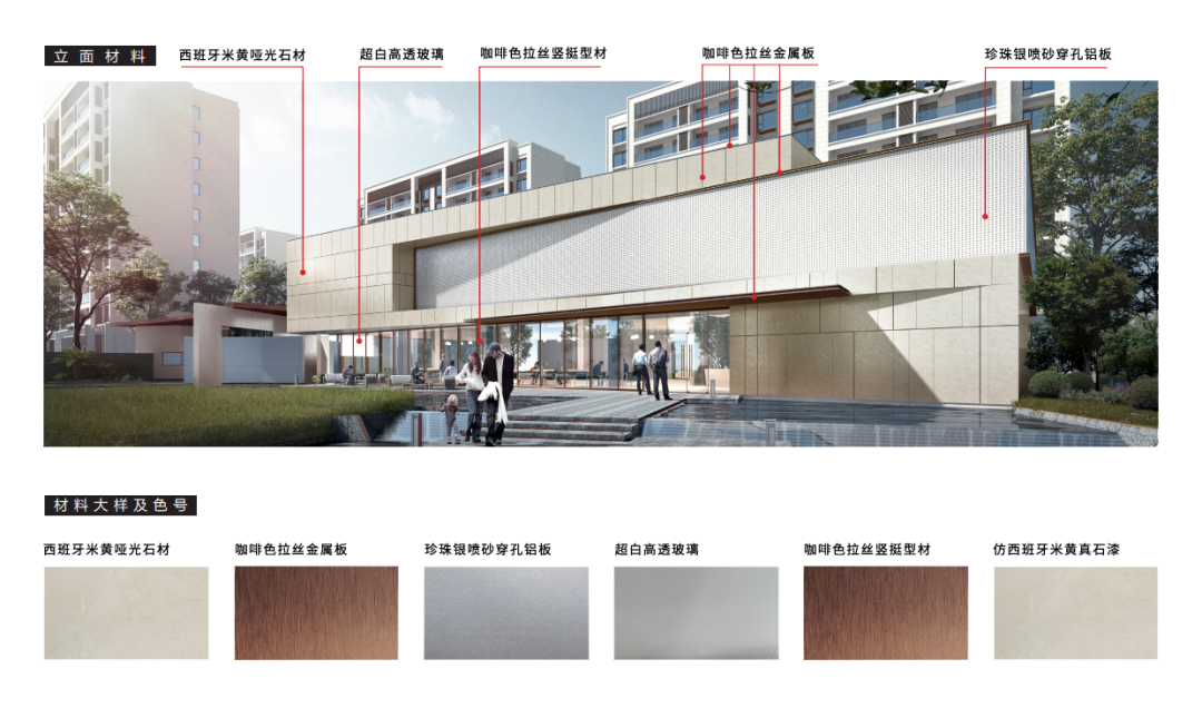 藝術(shù)館采用了多種材質(zhì)進(jìn)行組合,以超白通透的玻璃幕墻與咖啡色拉絲金屬板進(jìn)行搭接,以珍珠銀噴砂穿孔鋁板與西班牙米黃亞光石材相互映襯,并在色彩與燈光的助力下,成就熠熠生輝的公共空間。
