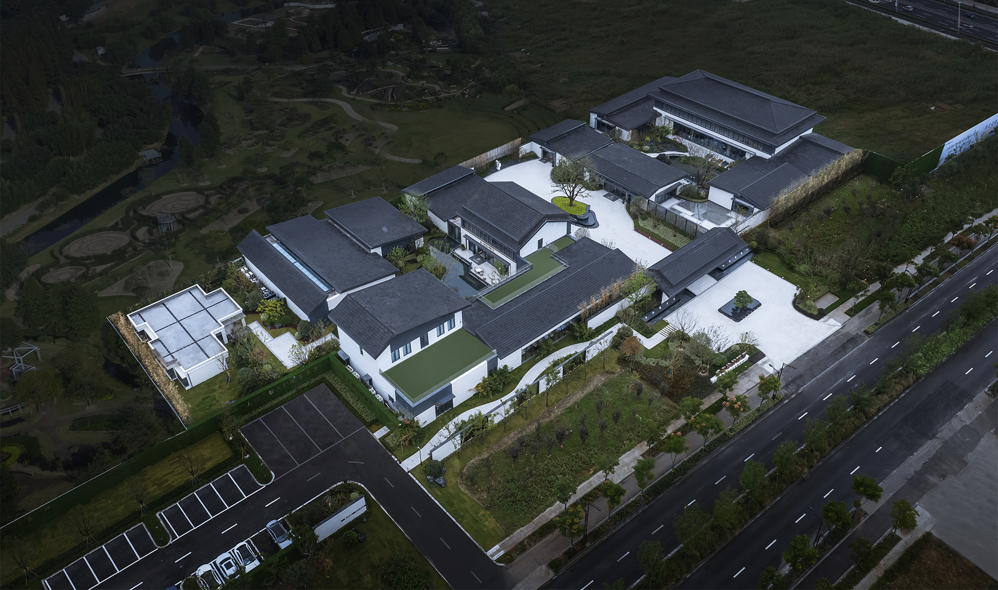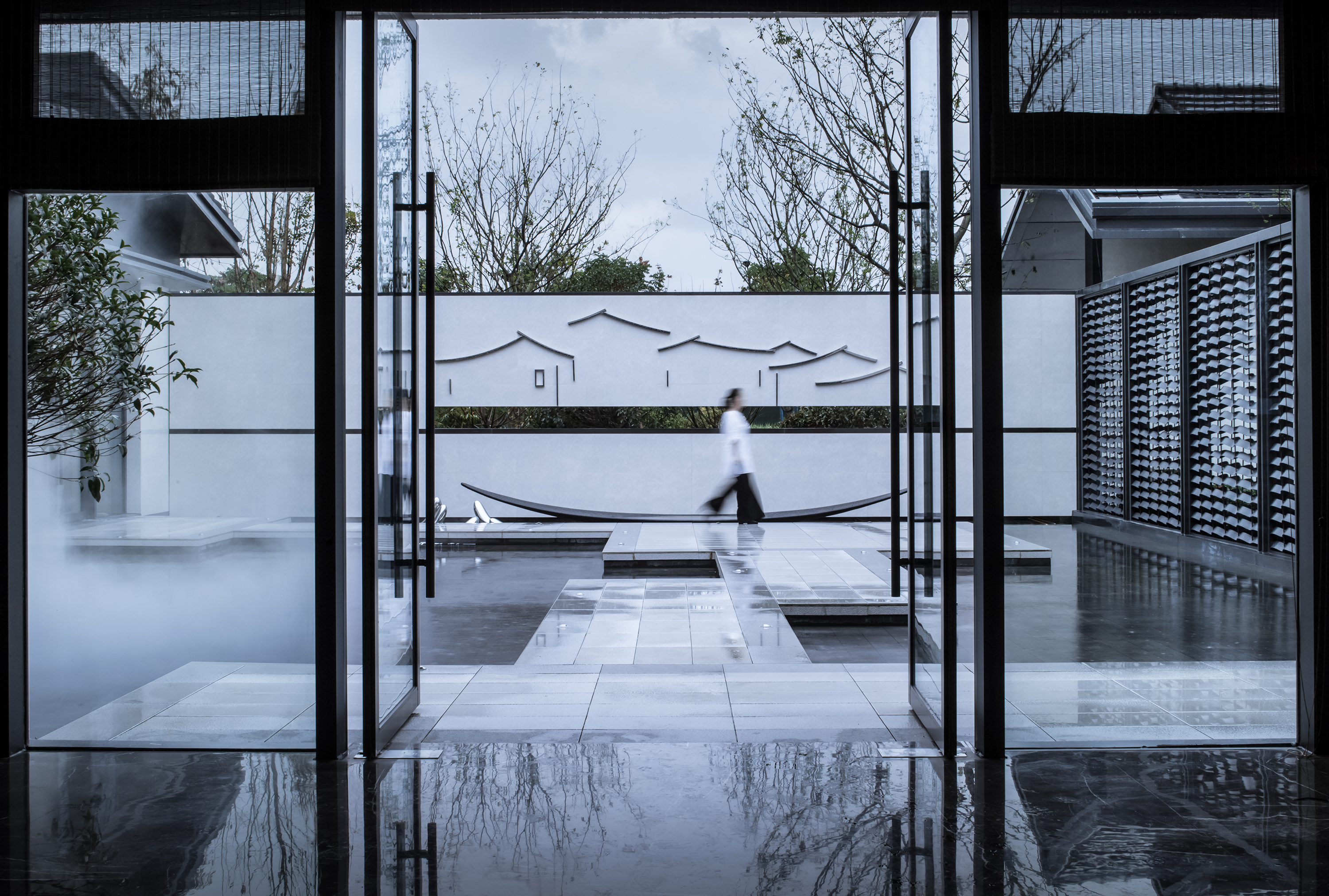 屋頂?shù)纳钌胀?,深色的金屬格柵、深色的鋁板包邊,與正立面的白色陶瓷薄板穿插映襯,則分明是國(guó)畫(huà)中“留白”的美學(xué)意境,也是水鄉(xiāng)“粉墻黛瓦”民居的寫(xiě)照。
