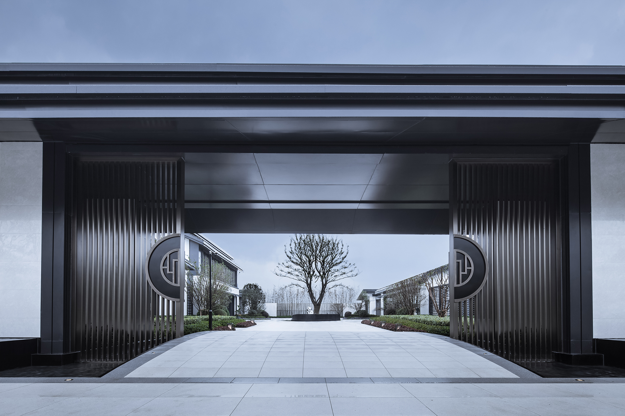 停車(chē)落客,徐徐緩步,來(lái)賓于迎客松后看到的便是格柵半掩的入口大門(mén)。它重檐疊起,立于示范區(qū)外圍水道微拱的小橋之上,沉穩(wěn)雅致,虛懷若谷,為內(nèi)部的庭院釋放無(wú)限的想象空間。