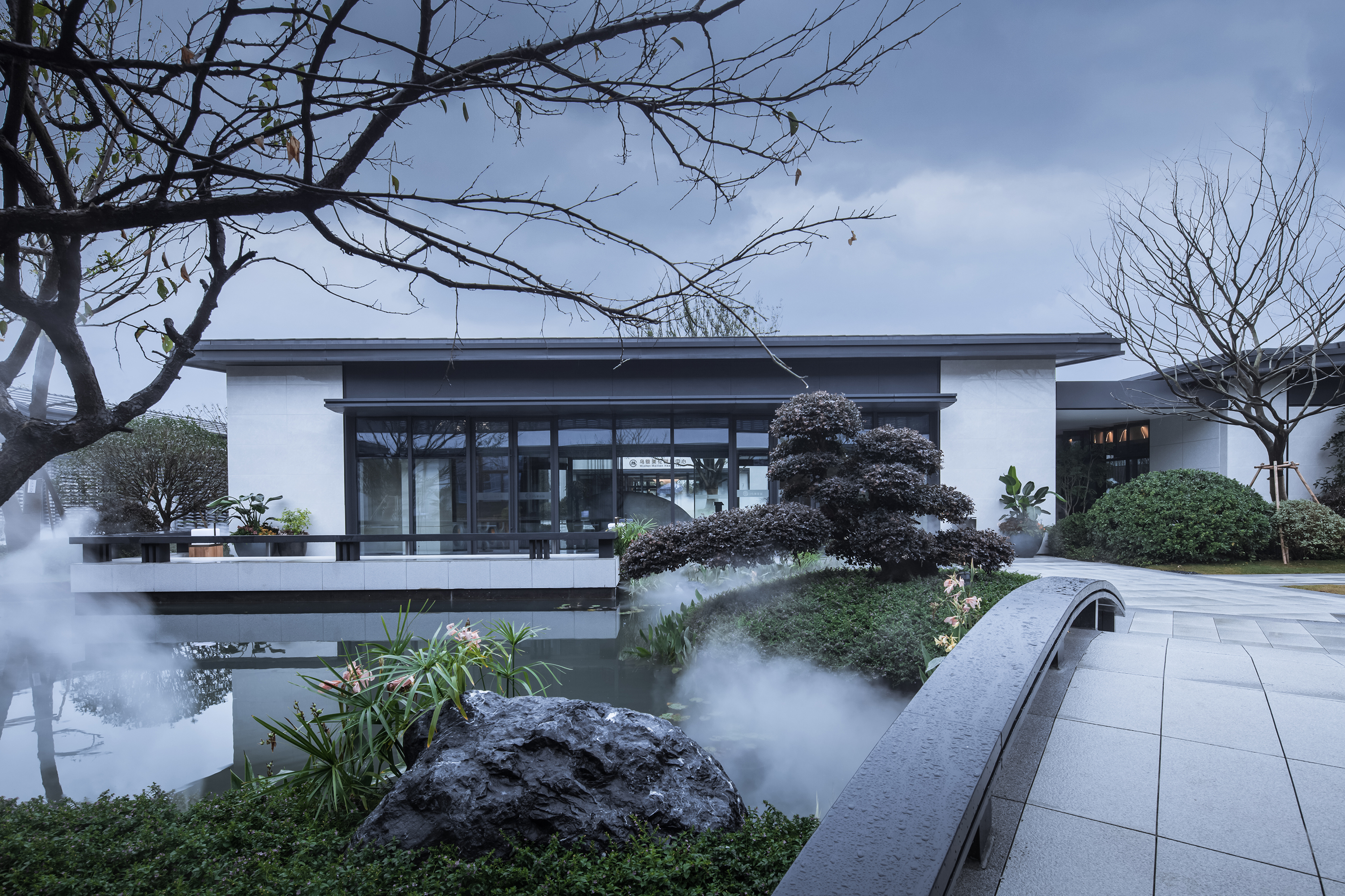 由中心廣場(chǎng)轉(zhuǎn)折,向南北各自沿廊道而行,呈現(xiàn)于眼前的便是薄霧輕攏,曲橋婉轉(zhuǎn)的水院空間。由中心廣場(chǎng)進(jìn)入過(guò)廊為“轉(zhuǎn)”,由地板鋪裝變水橋相間為“轉(zhuǎn)”,因“轉(zhuǎn)”而來(lái)的是廊院幽深的體驗(yàn),是水墨渲染的意境。