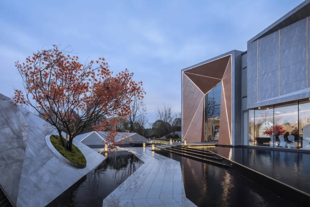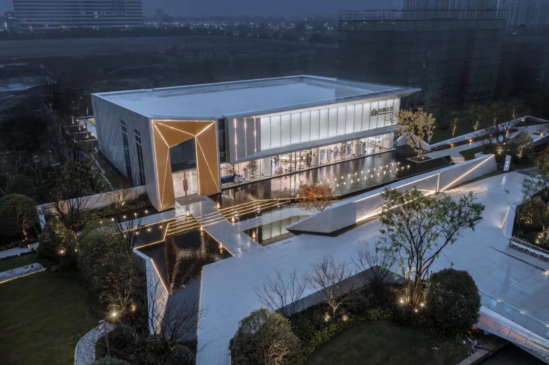 體驗(yàn)館入口,也是未來社區(qū)的主要出入口,其正對跨過前場水池的迎賓飛橋。橋體玲瓏,水面如鏡,晚櫻似火,非對稱的建筑體塊飾以斜交的直線燈帶,水天、樓館,相互映照,星光熠彩,打開了示范區(qū)動(dòng)線的序幕,也實(shí)現(xiàn)了未來社區(qū)使用上“所見即所得”的設(shè)計(jì)意圖。