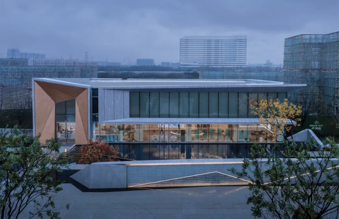 理想城示范區(qū),位于整個(gè)場地北側(cè)中部;體驗(yàn)館是項(xiàng)目的銷售中心,在示范區(qū)的場地中居中布置,是示范區(qū)的核心建筑。建筑寓意為“振翅的飛鳥“,以矩形為基本要素,通過切分延展的設(shè)計(jì)手法及不同的材質(zhì)組合變化,成為具有現(xiàn)代動(dòng)感和園林風(fēng)情的總體形態(tài)。
