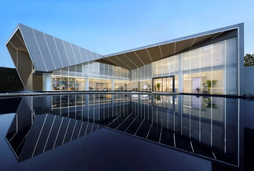 設(shè)計師以“森林秘境·未來理想國”的主題切入設(shè)計實踐,探索創(chuàng)新型立體花園生活模式,構(gòu)建會生長的理想智慧社區(qū)。示范區(qū)設(shè)計采用“遠眺群山碧水,掠影起伏”的山水理念,以折線為建筑表現(xiàn)形式,展示山川起伏、流水環(huán)繞的地域意境。造型以退界-切割-折塑-組合的建筑設(shè)計手法,呈現(xiàn)簡潔大氣、虛實相間的現(xiàn)代建筑空間。